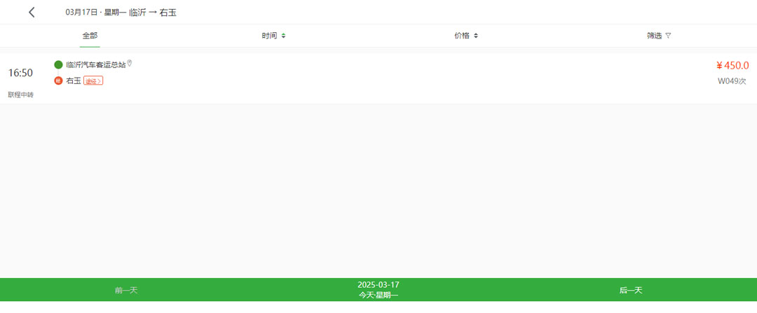 从山东临沂到右玉的汽车班次。16:50 从临沂汽车客运总站出发,为联程中转班次,票价 450 元,车次为 W049 次,可拨打 13468188195 咨询确认。