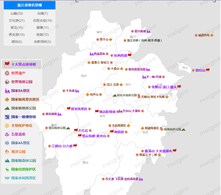浙江省有重要地貌景观800多处,水域景观200多处,生物景观100多处,人文景观100多处;18个*重点风景名胜区,42个省级风景名胜区;6座*历史文化名城,12座省级历史文化名城。