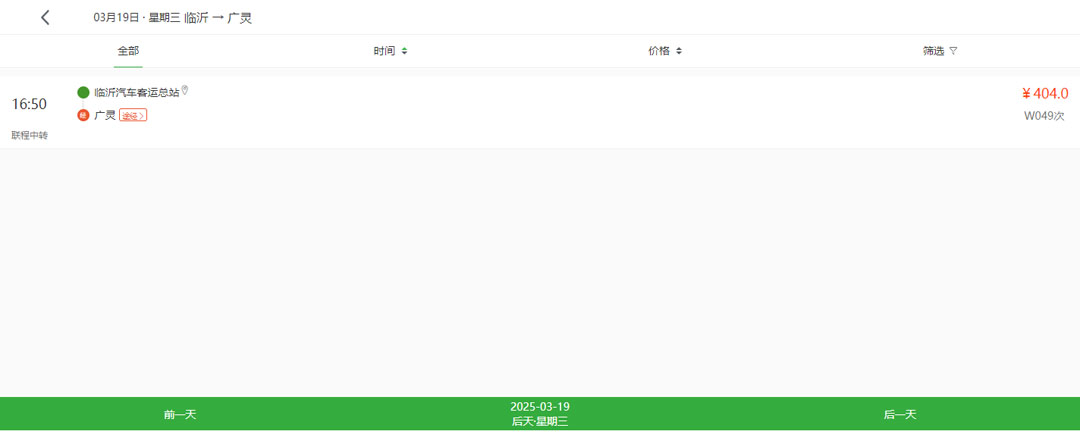 - 从临沂到广灵的汽车班次信息:16:50 从临沂汽车客运总站出发,票价 404.0 元,车次为 W049 次,且为联程中转。
